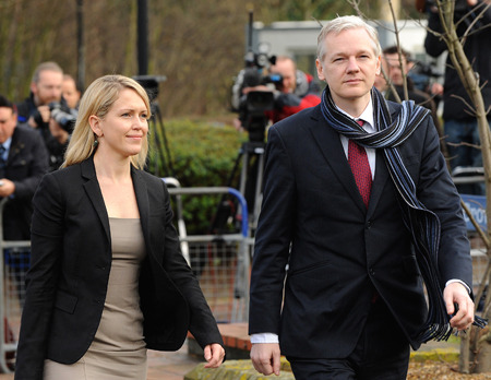 24日,倫敦,阿桑奇(右)和他的律師到達(dá)法院。