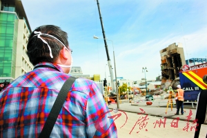 本報記者在封鎖線外看CTV大樓遺址。 本報特約記者 王世瑞 攝