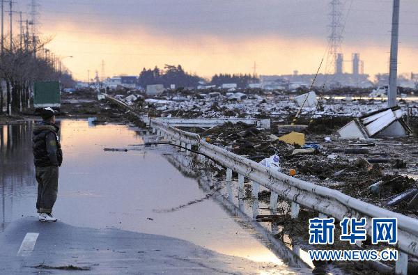 2011年3月12日,在日本東北部的仙臺,一名男子望著強震和海嘯侵襲過后的廢墟。