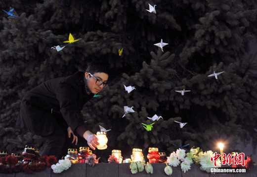 日本東北部地區11日發生9級地震并引發海嘯,目前已造成1萬多人死亡或失蹤,其中有3373人確認死亡。世界各地民眾紛紛祈福,希望日本受災民眾平安。圖為3月15日,在白俄羅斯明斯克,民眾為日本地震受災者祈福。