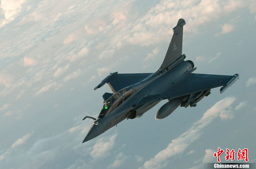 當地時間3月19日,一架法國陣風戰機攻擊利比亞期間接近一架空中加油機進行加油作業。