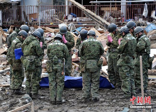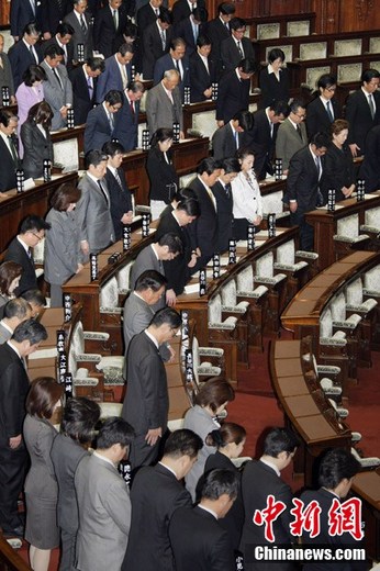 3月18日下午,日本民眾為一周前大地震中6000多名遇難者舉行默哀儀式,所有避難所和救援人員都停止作業,為死難者哀悼。