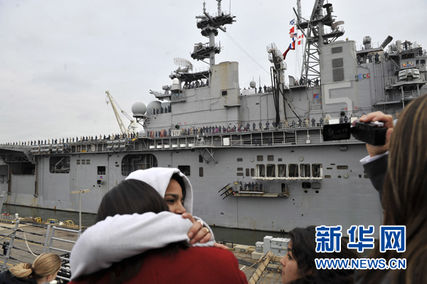 3月23日,在美國弗吉尼亞州諾福克海軍基地,親人們目送“巴丹島”號兩棲攻擊艦離港。當天,美國海軍派出由“巴丹島”號兩棲攻擊艦、“弗德臺地”號兩棲船塢運輸艦與“惠德比島”號船塢登陸艦組成的兩棲作戰艦隊,攜艦載戰斗機、海軍陸戰隊和醫療設施前往地中海參與針對利比亞的軍事行動。 新華社記者張軍攝