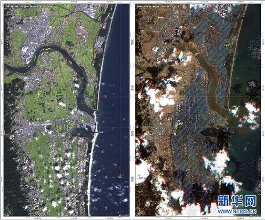 這是德國航空航天中心3月16日提供的日本部分地區海嘯前后對比衛星圖片。兩張圖片分別拍攝于2010年9月5日(左)和2011年3月12日(右)。