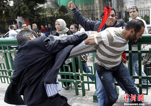 3月21日在埃及首都開羅解放廣場,約50名支持利比亞領(lǐng)導(dǎo)人卡扎菲的示威民眾包圍了聯(lián)合國秘書長潘基文,迫使潘基文撤退到附近的阿拉伯國家聯(lián)盟總部。圖為卡扎菲支持者與反對者互毆。