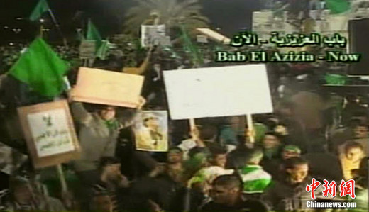 當地時間3月22日晚,多國部隊對利比亞發動19日以來的第4輪空襲。22日深夜,利比亞領導人卡扎菲站在他被導彈襲擊官邸的陽臺上向大批支持者發表演,指責西方國家對利比亞發動的軍事行動是“十字軍國家對伊斯蘭國家發動的新十字軍東征”,并且表示他和他的支持者將在對反叛武裝和多國部隊的戰斗中奮戰到底,取得最后的勝利。圖為利比亞國家電視臺的截圖。