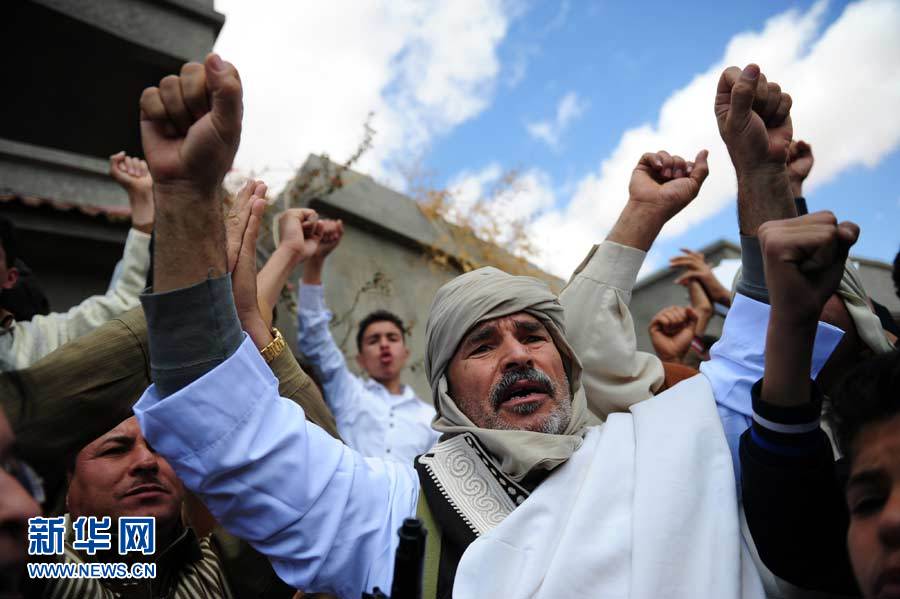 3月23日,在利比亞貝尼沃利德,卡扎菲的支持者們參加示威游行。利比亞首都的黎波里當地時間23日晚遭到西方戰機襲擊,導致平民傷亡。阿爾及利亞、加納、意大利等國呼吁和平解決利比亞危機。新華社記者楊光攝