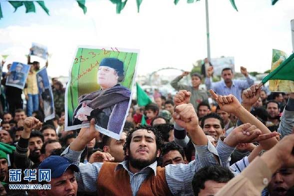 3月23日,在利比亞貝尼沃利德,卡扎菲的支持者們參加示威游行。新華社記者楊光攝