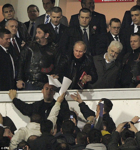 據外媒報道,當地時間24日晚,俄羅斯總理普京再次曝光“英氣造型”:在塞爾維亞首都貝爾格萊德短暫停留時,他身穿皮衣,和“夜狼”摩托車俱樂部(Night Wolves)成員一起看了場足球賽。
