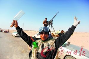 26日,利比亞反政府武裝手持菜刀慶祝勝利。