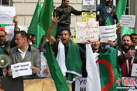 當地時間3月29日下午,約40個國家和國際組織的外長及代表在倫敦參加有關利比亞局勢的國際會議,上百名居住在倫敦的利比亞、卡塔爾等國抗議者在蘭卡斯特宮會場外示威,要求西方國家停止轟炸,停止干涉利比亞內政。中新社發 魏群 攝