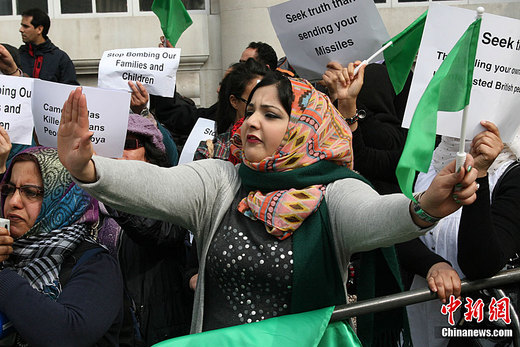 當地時間3月29日下午,約40個國家和國際組織的外長及代表在倫敦參加有關利比亞局勢的國際會議,上百名居住在倫敦的利比亞、卡塔爾等國抗議者在蘭卡斯特宮會場外示威,要求西方國家停止轟炸,停止干涉利比亞內政。中新社發 魏群 攝
