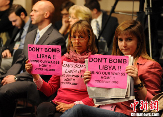 圖為美國著名反戰(zhàn)組織“粉紅密碼”兩名成員當(dāng)日在參議院軍事委員會(huì)的聽證會(huì)上舉著反對轟炸利比亞的標(biāo)語進(jìn)行抗議。中新社發(fā) 吳慶才 攝
