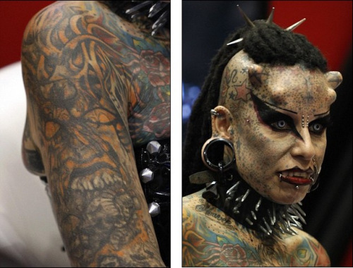 據(jù)了解,身為4個孩子媽媽的克里斯特納曾經(jīng)是一名律師,她聲稱自己在飽受前夫多年的家庭暴力侵害之后,決定轉(zhuǎn)行成為一名紋身藝術(shù)家。她首先把自己的身體變成了一件藝術(shù)品:全身幾乎100%的皮膚都有紋身覆蓋,頭部植入鈦合金,做成“角”;通過牙齒手術(shù),植入像吸血鬼一樣的尖牙。