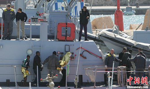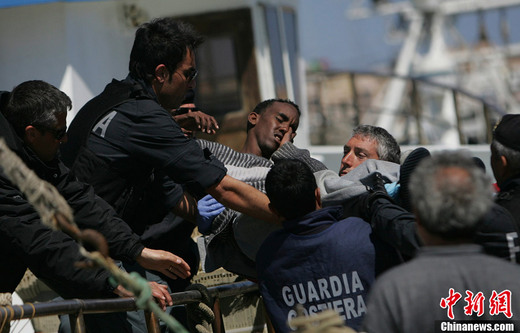 4月6日凌晨,一艘從利比亞出發的難民船在意大利西西里島以南海域傾翻,目前約有150至200人失蹤,至少15人遇難。當地救援人員目前已經成功營救47名幸存者,其中包括一名孕婦。圖為幸存難民在當地救援人員的幫助下抵達意大利蘭佩杜薩島。
