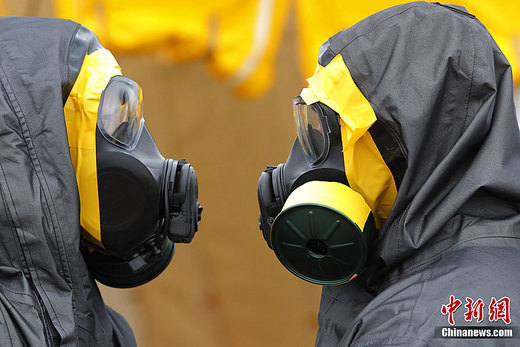 4月9日,日本東京,美國海軍陸戰隊的化學生物事件快速反應部隊在橫田空軍基地進行除污演練。