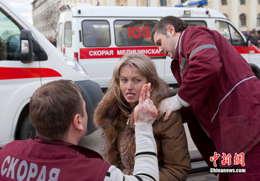 2011年4月11日傍晚6時許,白俄羅斯首都明斯克發(fā)生地鐵爆炸事件。事件已造成11人死亡,126人不同程度受傷。爆炸發(fā)生時刻,有兩列地鐵同時到達。爆炸所在地靠近白俄羅斯總統(tǒng)盧卡申科的官邸和明斯克最大的文化商業(yè)中心。圖為醫(yī)護人員檢查居民受傷情況。