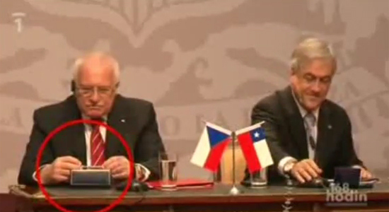 視頻截圖:捷克總統克勞斯(左)在新聞發布會上偷筆被拍。