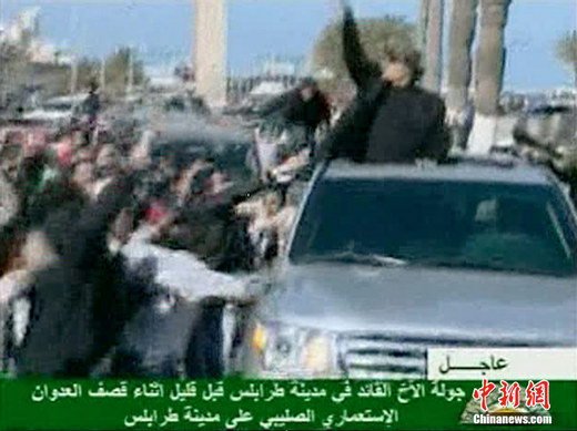 利比亞國(guó)家電視臺(tái)14日播放了卡扎菲當(dāng)天視察的黎波里并在街頭與支持者會(huì)面的視頻。卡扎菲站在一輛敞篷車上,身著休閑西裝,戴著墨鏡,揮舞拳頭,并和簇?fù)矶恋闹С终呶帐帧k娨暸_(tái)稱,就在卡扎菲現(xiàn)身的同時(shí),北約戰(zhàn)機(jī)對(duì)的黎波里進(jìn)行了輪番轟炸。