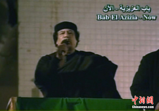 當地時間3月22日晚,多國部隊對利比亞發動19日以來的第4輪空襲。22日深夜,利比亞領導人卡扎菲站在他被導彈襲擊官邸的陽臺上向大批支持者發表演,指責西方國家對利比亞發動的軍事行動是“十字軍國家對伊斯蘭國家發動的新十字軍東征”,并且表示他和他的支持者將在對反叛武裝和多國部隊的戰斗中奮戰到底,取得最后的勝利。圖為利比亞國家電視臺的截圖。