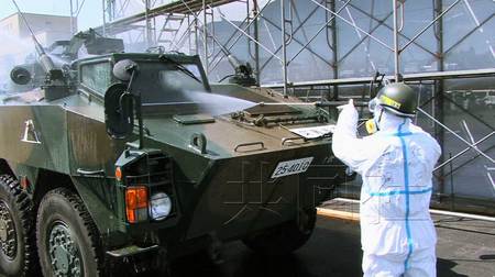 錄像中,日本自衛(wèi)隊員正在對裝甲車進(jìn)行去污作業(yè)。12日攝于福島縣廣野町的核事故處置中心“J-Village”。圖片由自衛(wèi)隊提供。(共同社)