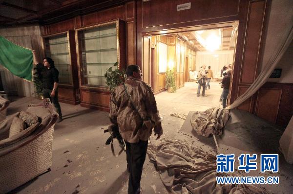 4月25日,在利比亞首都的黎波里,利比亞士兵在被轟炸的利比亞領(lǐng)導人卡扎菲的官邸內(nèi)查看。北約戰(zhàn)機25日凌晨對利比亞領(lǐng)導人卡扎菲在的黎波里的官邸實施轟炸。 新華社/路透