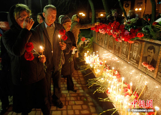 2011年4月26日,烏克蘭切爾諾貝利核電站附近的小城斯拉夫蒂奇,人們點燃蠟燭紀念在切爾諾貝利核事故中英勇獻身的消防員。今年的4月26日是切爾諾貝利核事故25周年的紀念日。1986年4月26日當地時間1時24分,前蘇聯烏克蘭共和國切爾諾貝利核電站發生嚴重泄漏及爆炸事故,這是人類和平利用核能以來最嚴重的災難之一。