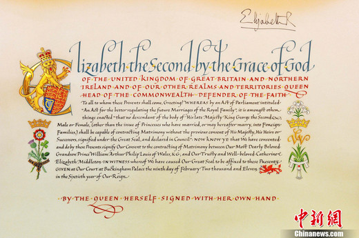 當地時間21日,英國女王官方同意威廉王子迎娶凱特-米德爾頓的官方文書發布。這份由女王親筆簽署、用花體字謄抄的詳盡準許通告,正式宣布同意“我們最為至愛的皇孫威爾士王子、嘉德騎士威廉-亞瑟-菲利普-路易斯,和我們信任的深受喜愛的凱瑟琳-伊麗莎白-米德爾頓結為連理”。