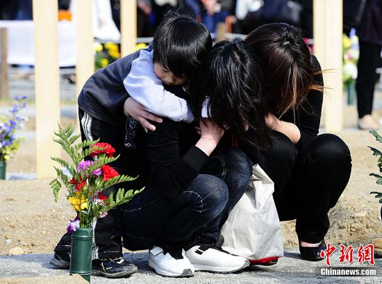 4月28日是日本大地震遇難者49天忌日,在日本宮城縣女川町舉行的祭奠“3·11東北大地震”遇難者活動中,年幼的孩子與自己的親人在遇難者墓前緊緊相依,互相安慰。中新社記者 侯宇 攝