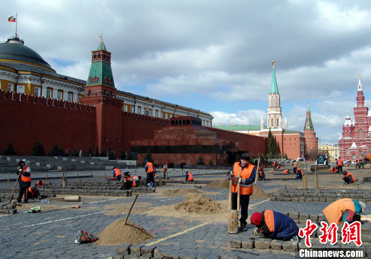 4月27日,俄羅斯首都莫斯科紅場。為迎接5月9日在此舉行的“勝利日”閱兵式,工人們正在加緊修繕紅場路面。中新社發 田冰 攝