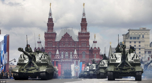 9日,莫斯科舉行了紀念衛(wèi)國戰(zhàn)爭勝利66周年閱兵式。2萬名士兵穿過克林姆林宮前廣場,接受檢閱的載有百余件機械化武器裝備隊伍——包括裝甲車和白楊-M(Topol-M)洲際彈道導彈。另外,直升機中隊懸吊著旗幟掠過紅場,但戰(zhàn)斗機未在閱兵式中現(xiàn)身。