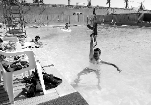 8月25日,一名反對(duì)派士兵在卡扎菲兒女豪宅的泳池中舉起步槍