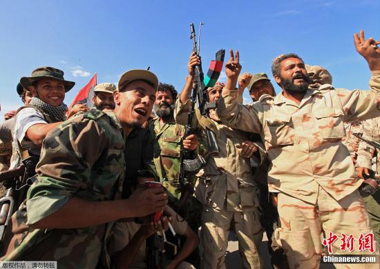 利比亞“全國過渡委員會”武裝20日稱在蘇爾特已經俘獲了卡扎菲。據利比亞過渡委武裝一名官員稱,被俘的卡扎菲雙腿受傷。圖為 “過渡委”武裝人員慶祝攻占蘇爾特。