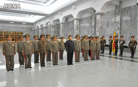 金正恩等來到錦繡山太陽宮,向金日成和金正日表示敬意。