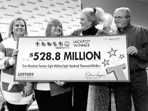 田納西彩票公司首席執(zhí)行官哈格羅夫(右二)向魯濱遜夫婦及女兒頒發(fā)巨款“支票”(圖片來源:新華/美聯(lián))