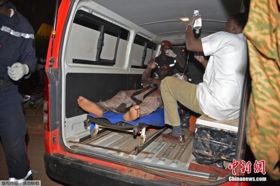據外媒當地時間1月16日報道,布基納法索內政部長稱,目前已經有126名人質從遭恐怖分子襲擊的首都酒店中逃出,多名恐怖分子被擊斃。圖為受傷人員被送往醫院。