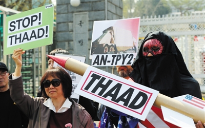 韓美部署薩德系統的磋商已經持續一段時間,一直遭到韓國民眾的反對。圖為2015年4月10日,韓國民眾在國防部前示威,反對美國在朝鮮半島部署“薩德”系統。資料圖片
