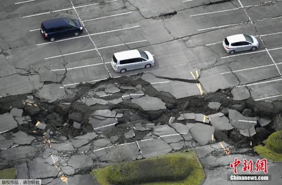 日本九州于當地時間4月16日凌晨發生里氏7.3級地震。據統計,目前死者已增至42人、9人下落不明。圖為當地時間4月16日,日本熊本縣發生地震導致南阿蘇城一個地面停車場發生地面塌陷。