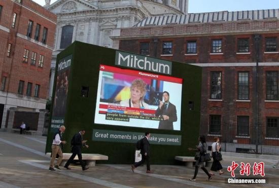 6月24日,英國脫離歐盟導致倫敦股市劇烈震蕩,英國富時100指數當天開盤一度下跌超過8%。圖為倫敦證券交易所門前廣場上的大屏幕實時播報英國脫歐的最新動態。中新社記者 周兆軍 攝