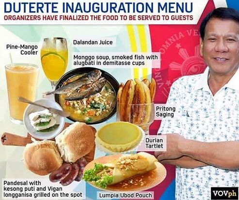 據報道,總統發言人馬丁·安達納爾透露,宴會將有627位高官和支持者出席,這些人將在宴會上享用一些手拿式食品,比如車前草餡餅,芒果豆湯、水牛奶制成的奶酪面包,還有榴蓮派。通常,就職典禮的傳統飲品為葡萄酒,而杜特爾特一反傳統地選擇了椰奶。