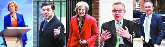上圖:英國保守黨6月30日宣布,該黨5名下院議員將競選下一任黨魁,勝選者預計于今年10月接替卡梅倫出任保守黨新黨魁和新首相。從左至右分別為:負責能源事務的國務大臣安德烈婭·利德索姆、就業(yè)和養(yǎng)老金事務大臣斯蒂芬·克拉博、內政大臣特雷莎·梅、司法大臣邁克爾·戈夫和前國防大臣利亞姆·福克斯。