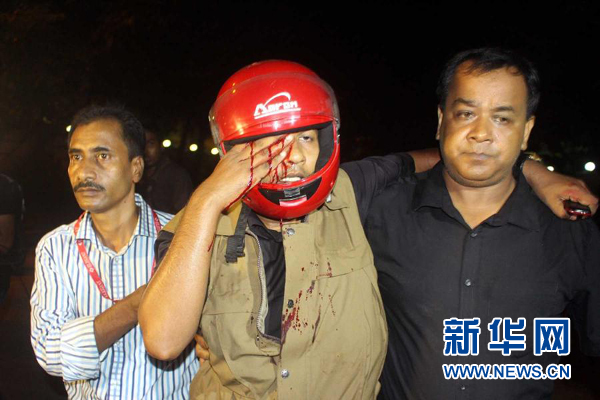 7月2日凌晨,在孟加拉國首都達(dá)卡,人們轉(zhuǎn)移襲擊事件中的受傷警察。新華社發(fā)