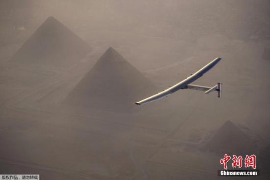 當(dāng)?shù)貢r間7月13日,瑞士飛行員駕駛的全球最大太陽能飛機“陽光動力2號”從埃及吉薩金字塔上空飛過,之后飛機在開羅國際機場降落。