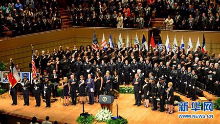 這是7月12日在美國得克薩斯州北部城市達拉斯拍攝的遇害警察悼念儀式現場。當日,美國總統奧巴馬在得克薩斯州北部城市達拉斯舉行的5名遇害警察的悼念儀式上呼吁示威者、警方及公眾三方拋棄偏見,敞開心扉,共同努力來解決美國國內日益顯現的種族問題和暴力活動。新華社發(許迅攝)