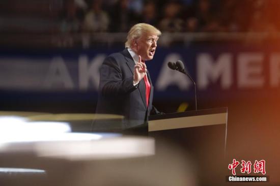 資料圖:當?shù)貢r間7月21日,在美國俄亥俄州克利夫蘭舉行的共和黨全國代表大會上,共和黨總統(tǒng)候選人特朗普發(fā)表演講。中新社記者 廖攀 攝