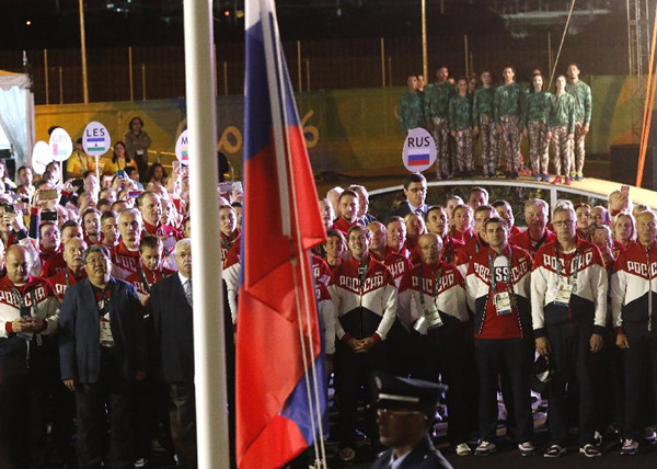 8月3日,俄羅斯體育代表團(tuán)成員在升旗儀式上。 當(dāng)日,俄羅斯體育代表團(tuán)在里約奧運(yùn)村舉行升旗儀式。 新華社記者沈伯韓攝