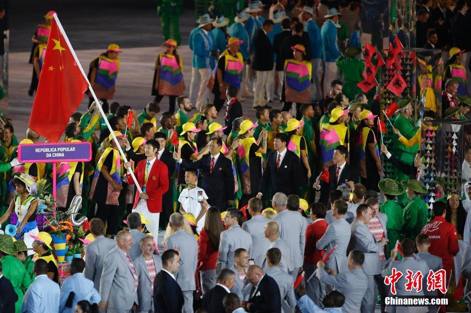 當地時間8月5日晚8時,2016里約奧運會開幕式在里約熱內盧馬拉卡納體育場舉行,各國代表團入場。圖為中國代表團入場,雷聲擔任旗手。中新網記者 盛佳鵬 攝