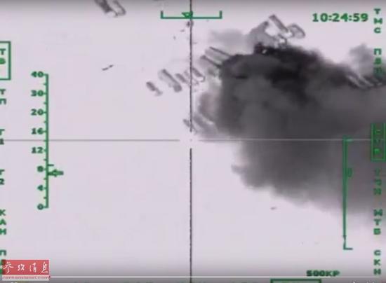 圖為俄國防部最新公布的俄空軍11月18日空襲敘境內恐怖組織目標的視頻截圖,圖為遭襲擊的恐怖組織油車。