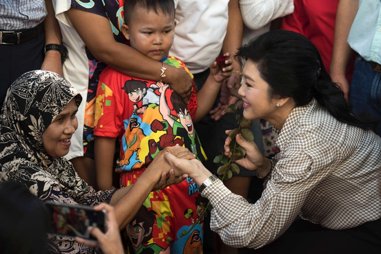 當地時間2016年8月7日,泰國曼谷,泰國前總理英拉現身參加新憲法草案公投,獲支持者獻花和熱烈歡迎。