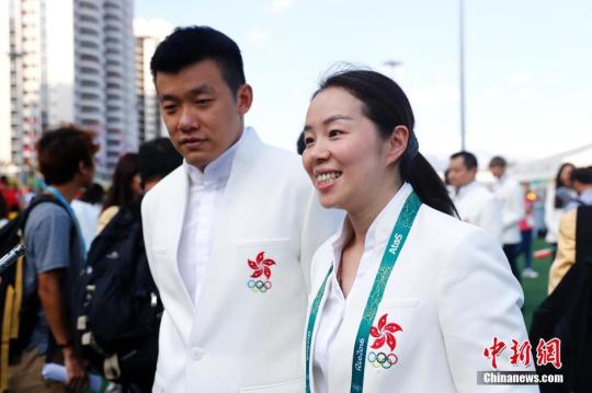 資料圖:帖雅娜、唐鵬夫婦參加中國香港奧運代表團在里約奧運村舉行升旗儀式。中新網記者 富田 攝